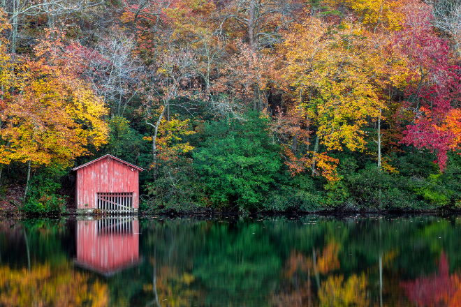 Just a short drive up the Parkway, DeSoto State Park is a hiker’s paradise in autumn. Trails wind through forests bursting with golden leaves, while picnic spots and rustic cabins invite you to slow down and stay awhile. You also cannot miss one of Alabama’s most photographed spots: DeSoto Falls. The 104-foot cascade is surrounded by fall foliage, and the boat house located at the top of the falls creates a picturesque fall scene that looks like it was pulled straight from a painting.