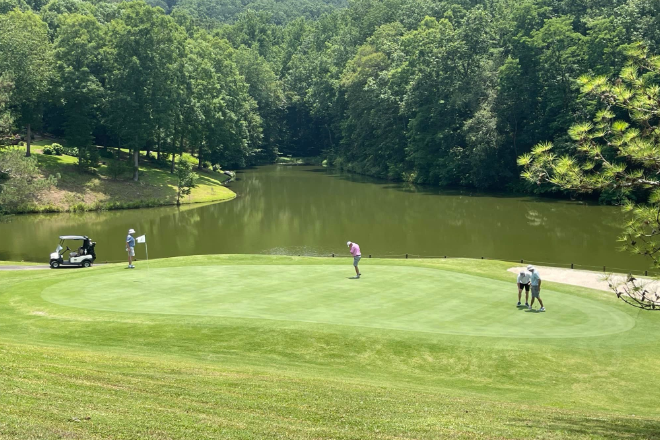 This private club is worth checking into if you can snag an invite. Nestled in gorgeous Big Wills Valley, the 18-hole course offers pristine fairways and greens — plus plenty of water hazards with seven greens by lakes or Big Wills Creek.
