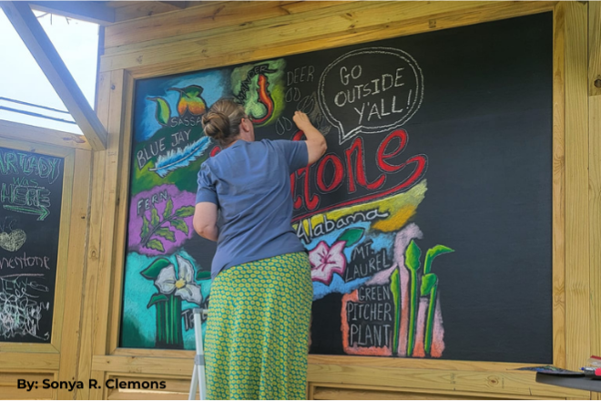 The Pathway to Community project, a collaboration between the Little River Arts Council and the Mentone Educational Resources Foundation (MERF), is a vibrant display of community spirit and creativity. Located along MERF’s 1/4-mile walking trail on Alabama Highway 117 at the eastern edge of Mentone, this project invites visitors to experience art in a truly interactive way.
