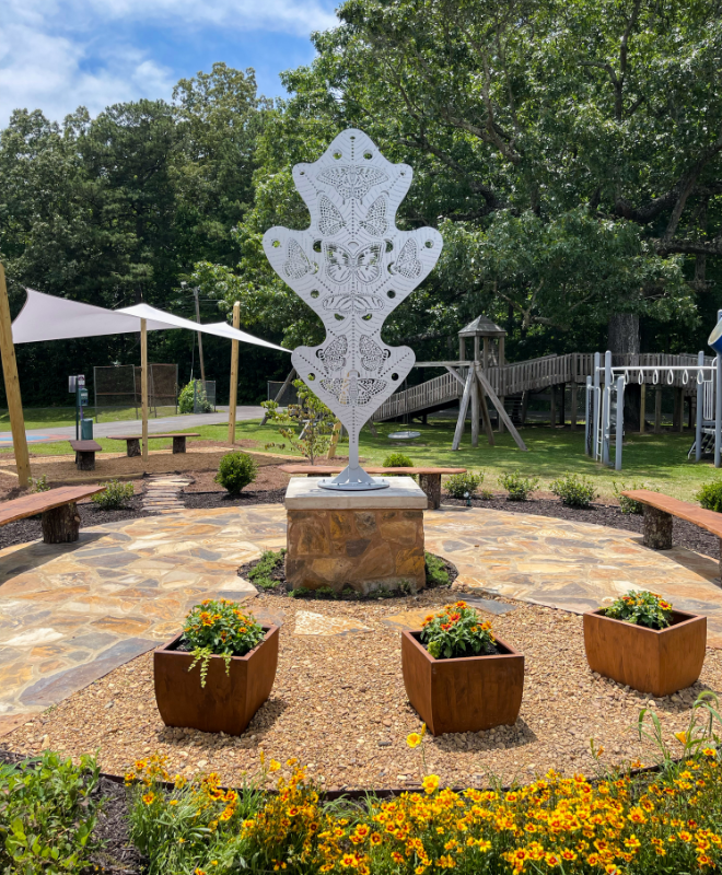 Surrounded by vibrant blooms and natural greenery, the sculpture invites visitors to reflect on the region’s rich Native American heritage. Whether you’re exploring the arts center’s indoor galleries or strolling through the tranquil garden, the Sequoyah Sculpture is a must-see stop for art and history enthusiasts alike.