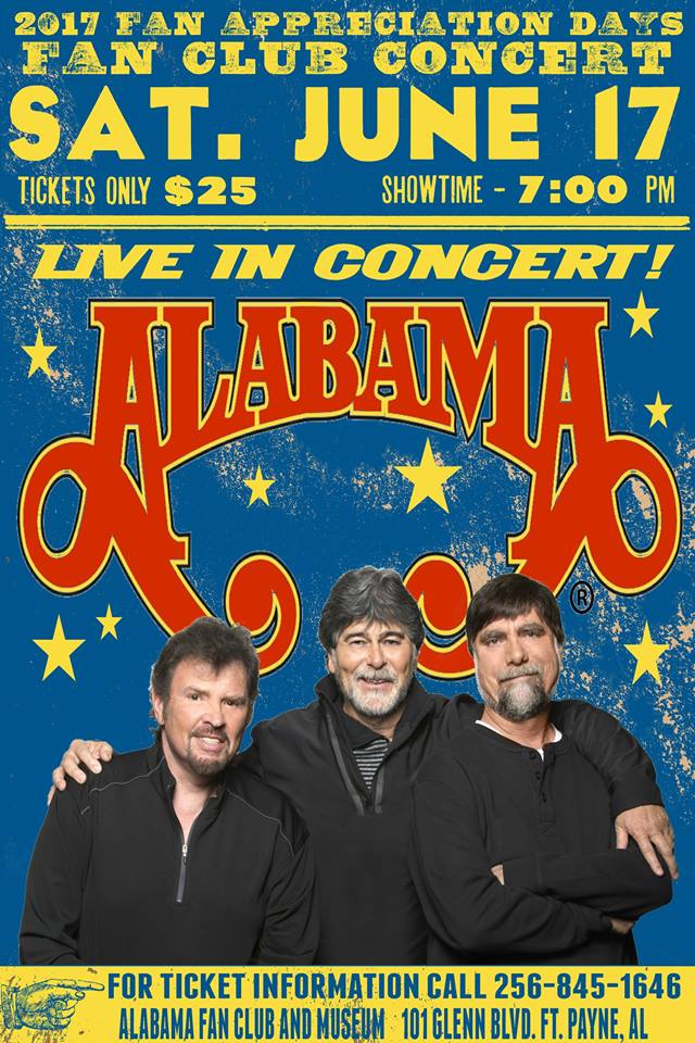 Limited number of tickets available. Must have current Membership number to purchase, or you can purchase a membership to the ALABAMA Fan Club and then buy tickets to the show.