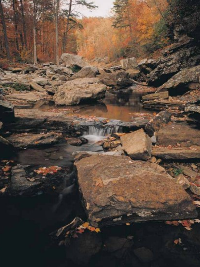 Just a short drive up the Parkway, DeSoto State Park is a hiker’s paradise in autumn. Trails wind through forests bursting with golden leaves, while picnic spots and rustic cabins invite you to slow down and stay awhile. You also cannot miss one of Alabama’s most photographed spots: DeSoto Falls. The 104-foot cascade is surrounded by fall foliage, and the boat house located at the top of the falls creates a picturesque fall scene that looks like it was pulled straight from a painting.