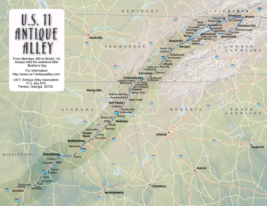 Held annually on the four-day weekend (Thursday – Sunday) following Mother’s Day in May, this 502-mile festive roadside sale is held on scenic U.S. Highway 11 from Meridian, Mississippi to Bristol, Virginia – with not-to-be-missed stops in: DeKalb County, AL; Dade County, GA; Chattanooga & Knoxville, TN.