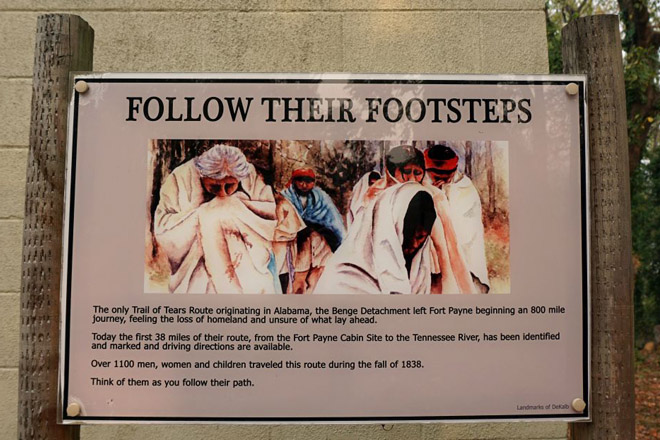 Wills Valley, present day Fort Payne, was home to the Cherokee Nation. The tragic era of the Trail of Tears in the 1830’s saw a forced removal of this and other Indian Nations from their homelands east of the Mississippi to new lands in Oklahoma. “Fort Payne” was 1 of 5 stockades built in Alabama during this forced removal.