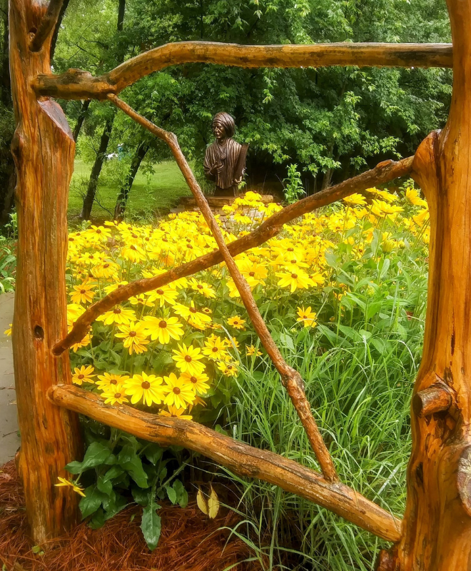 Surrounded by vibrant blooms and natural greenery, the sculpture invites visitors to reflect on the region’s rich Native American heritage. Whether you’re exploring the arts center’s indoor galleries or strolling through the tranquil garden, the Sequoyah Sculpture is a must-see stop for art and history enthusiasts alike.