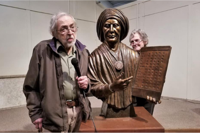 Nestled in the serene garden of the Mentone Arts Center, the Sequoyah Sculpture stands as a powerful tribute to Cherokee history and culture. Created by artists Betsy Scott and Carl McCleskey, this bronze sculpture was donated to the arts center in 2019 and has since become a cherished piece of Mentone’s outdoor art scene. The sculpture depicts Sequoyah, the Cherokee silversmith and creator of the Cherokee syllabary, holding a tablet inscribed with his written language.