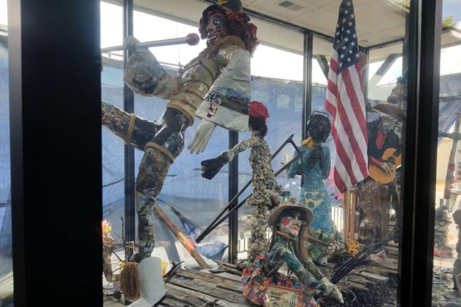 One of the most unique sculptures in the county is a life-sized metal dinosaur that sits atop Lookout Mountain and greets visitors along the Lookout Mountain Parkway. Junkosaurus Wrecks is a twenty-one feet tall sculpture built by local artist Ekim Snaggog. The sculpture weighs approximately one and a half tons and was constructed with over two thousand pieces of junk (from anything as small as a spark plug to as large as an entire lawn mower).